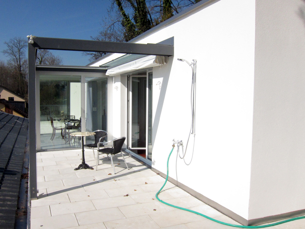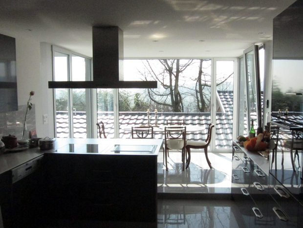 Die weitgehend unzugängliche Dachterrassenfläche sowie die zur Aussichtslage verschlossene Fassade werden durch die räumliche Ausweitung im Küchenbereich und die grosszügige Öffnung der Fassade optisch und nutzungsmässig miteinander verbunden.