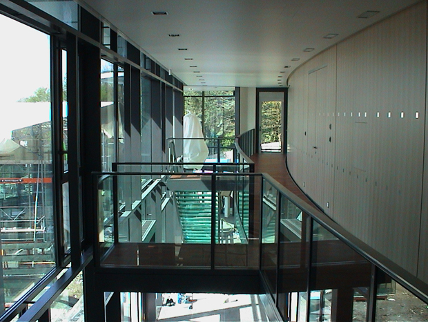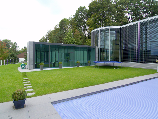 3 zusammen- und nebeneinandergestellte Baukörper bilden den höchst privaten Gartenhof, auf dem in einer Art Galerie alle Bewegung zwischen den einzelnen Trakten stattfindet.