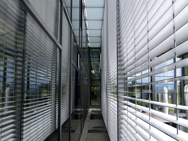 Die durchgehende Verglasung gewährt überall Fernsicht, geschützt durch mechanisch bewegte, geschosshohe Beschattungselemente.