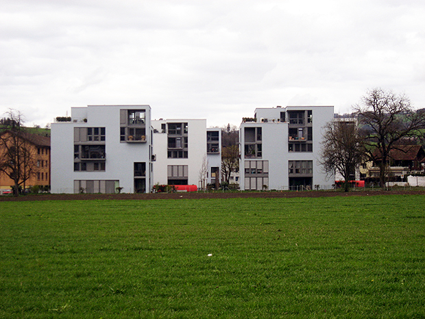 5 "locker hingeworfene" Würfelbauten enthalten 42 Wohnungen. Die unterschiedliche Orientierung und Raumanordnung in den Wohnungen schafft in besonderem Mass eine Identifikation der Bewohner mit der Siedlung.